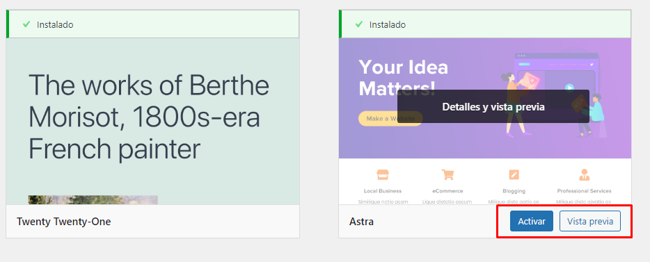 Una vez completado el proceso de instalación, verás los botones de Vista previa y Activar cuando pases el ratón por encima del tema.