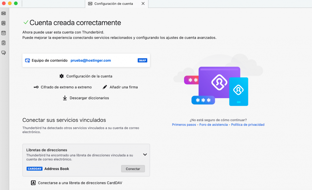 Pulsa Hecho para terminar y espera a que Thunderbird verifique la configuración del correo electrónico. Aparecerá una nueva página que muestra que tu cuenta está ahora conectada a Thunderbird. Pulsa Finalizar para ver el buzón.