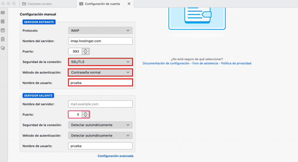 Las opciones de configuración manual aparecerán en la misma página. Aquí, edita los nombres de los servidores, los puertos y los ajustes de seguridad en función de los detalles de configuración que hayas recopilado. Configura los ajustes adicionales de la cuenta según sea necesario.