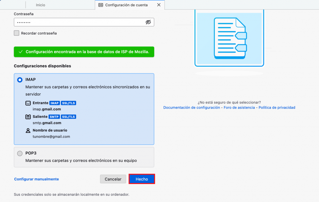 Thunderbird buscará y rellenará automáticamente los datos del servidor de correo saliente y entrante del proveedor de correo. También te dará la opción de elegir IMAP o POP como protocolo de correo entrante. Después de hacer tu elección, pulsa el botón Hecho.