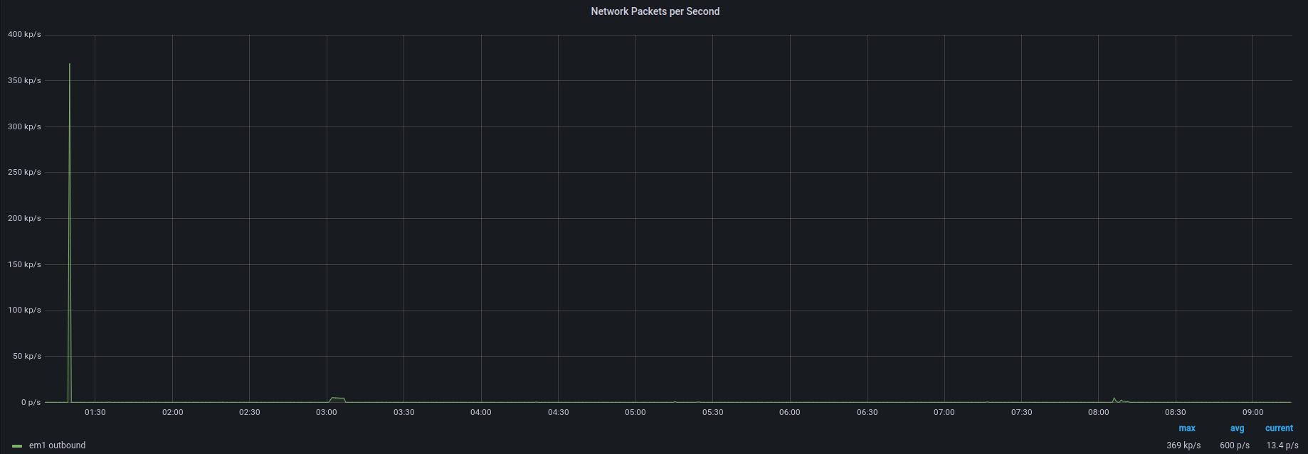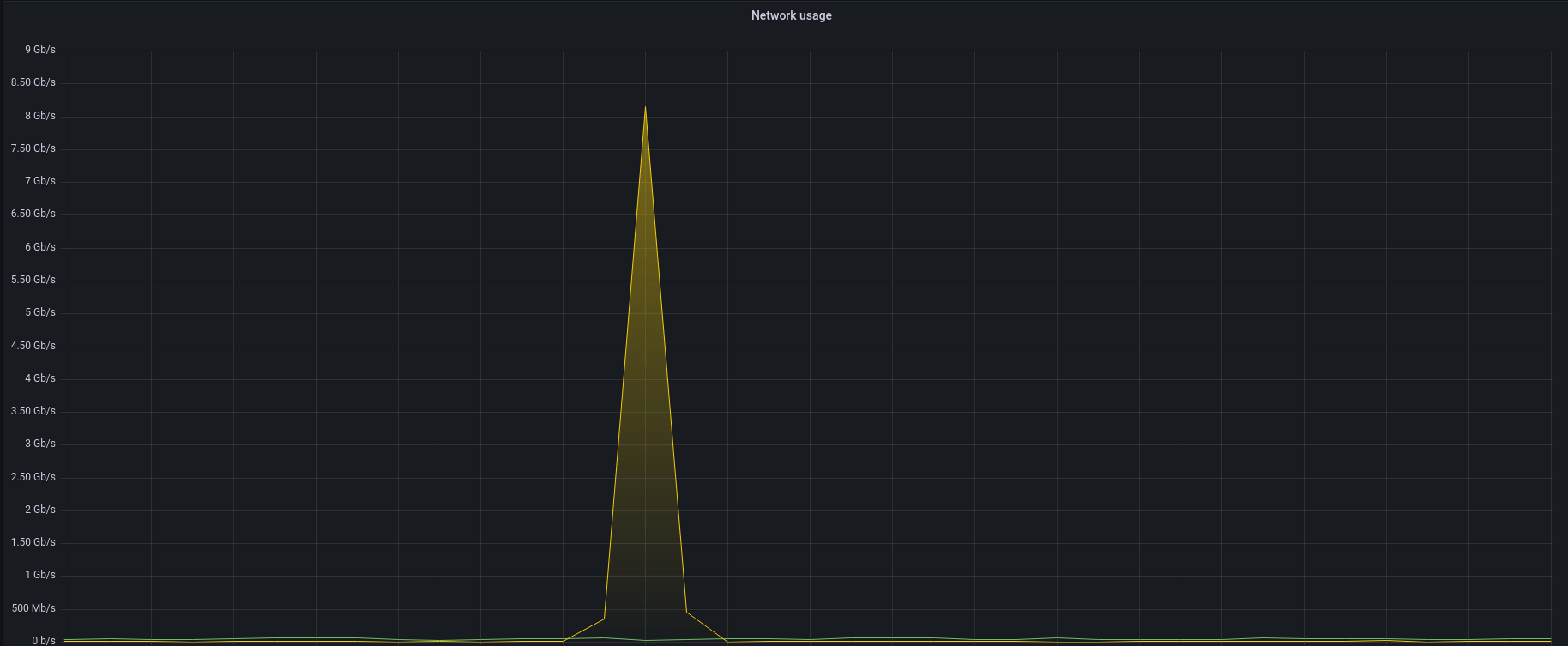 ¿Cómo se ve el manejo de un ataque DDoS en Grafana? Veamos un ataque reciente con 8 Gbps y 1 Mpps de tráfico a continuación.