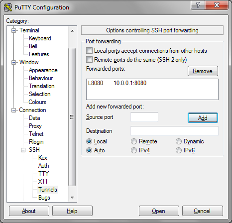 En el árbol de navegación de la izquierda debes seleccionar Connection > SSH > Tunnels. Ingresa el puerto que quieres conectar localmente a un “Source port” (puerto fuente). Ahora agrega la dirección de destino (el servidor que está disponible desde tu puerta SSH, pero que no está en tu equipo local) como “Destination” (destino), tal y como se muestra en la siguiente imagen: