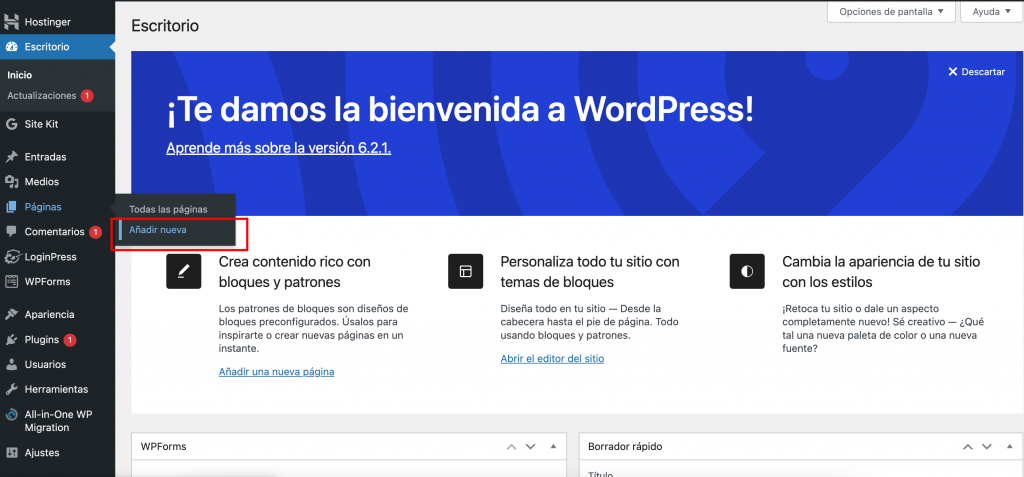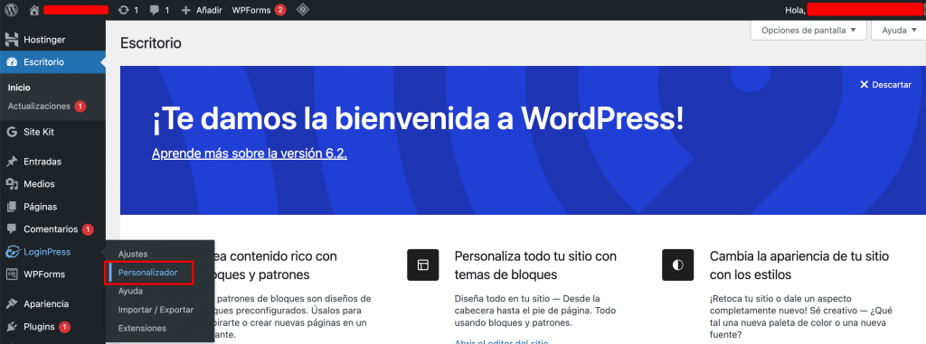 Antes de personalizar tu página de inicio, debes activar la extensión necesaria. Para ello abre el panel de administración de WP y sigue estos pasos:
