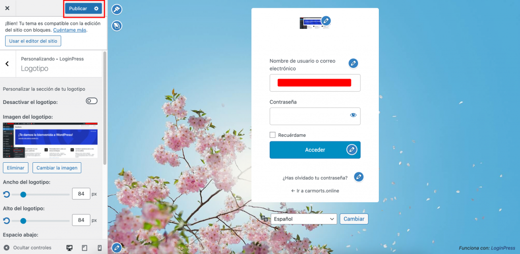 Este plugin no ofrece funciones completas de personalización visual. Aunque puedes añadir tu propio logotipo, no puedes cambiar el fondo del formulario de acceso sin código CSS.