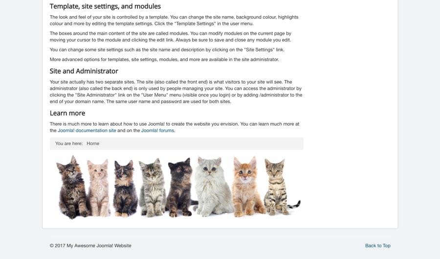 Como ejemplo, hemos agregado un anuncio de imagen con gatitos al pie de página de nuestro Joomla! sitio web.