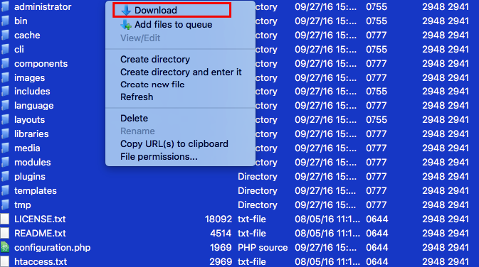 Otra forma de descargar archivos Joomla es usar un cliente FTP. El proceso es sencillo: todo lo que necesita hacer es navegar a la carpeta Joomla, seleccionar todos los archivos y presionar el botón Descargar.