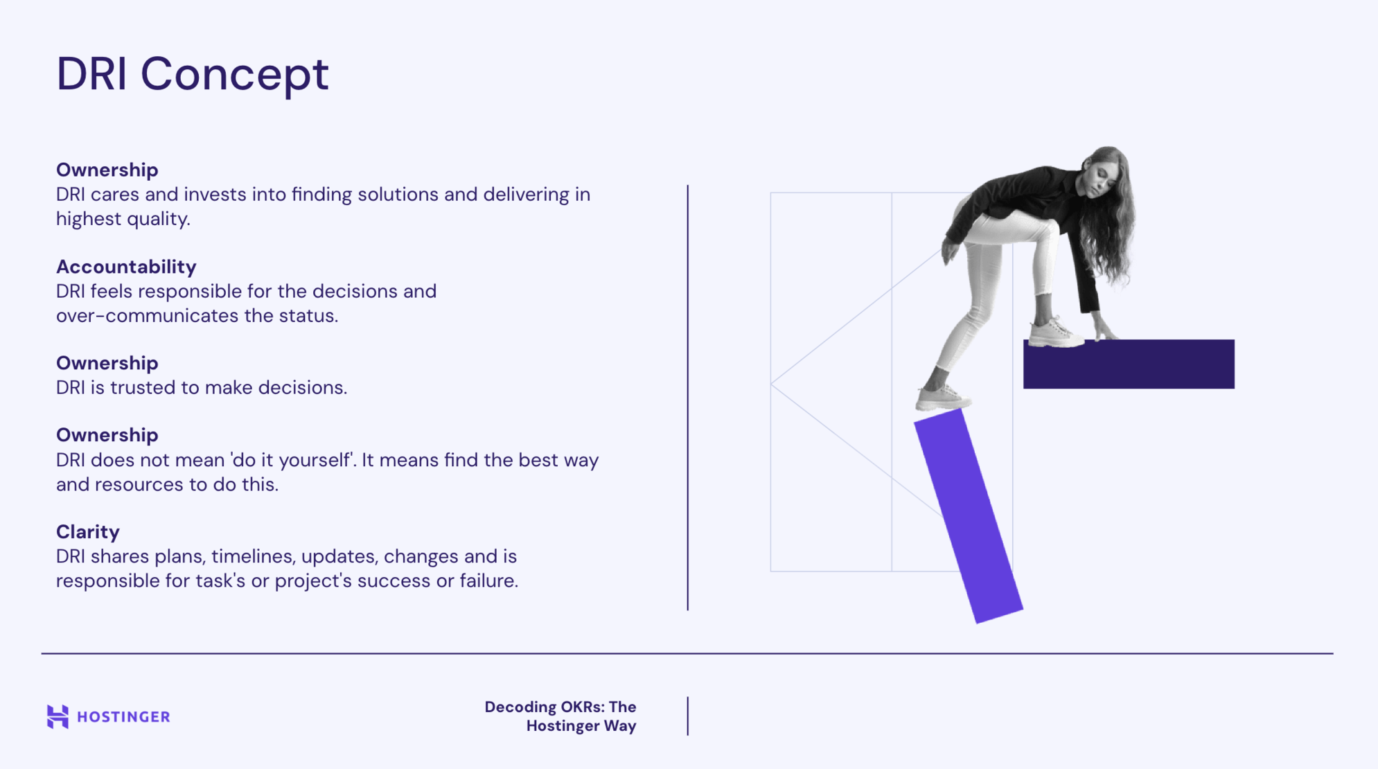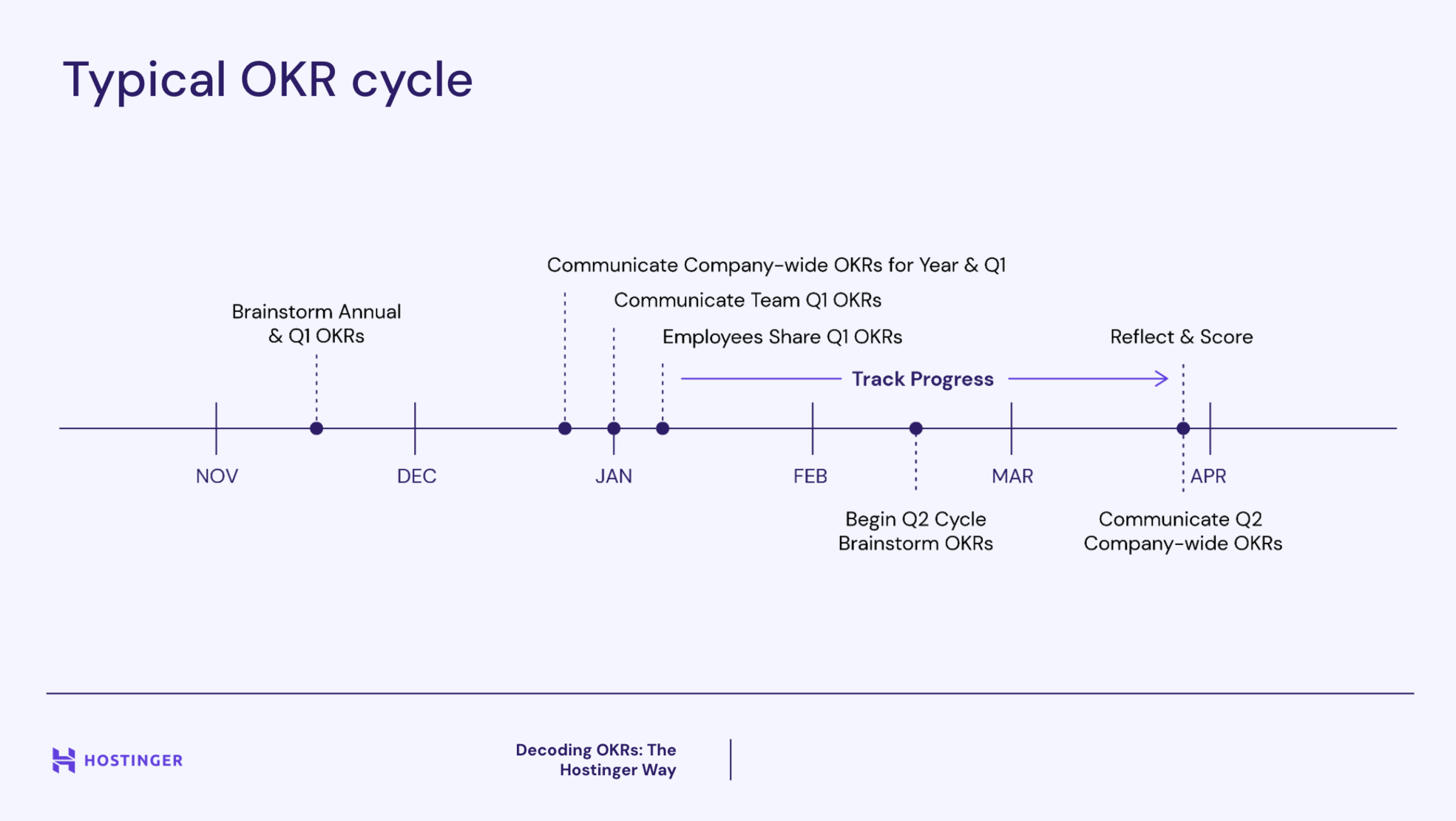 “This model engages every team member and leader in contributing ideas. For the whole planning cycle, it takes around one month. First, the CEO and Leadership team synthesize ideas, identify key focus areas, and establish company-wide priorities and OKRs objectives for upcoming Q. After that comes Hostinger Focus week, which is dedicated to team and 1on1 meetings, and intensive planning company-wide, ensuring a collaborative and comprehensive process. During this week, all teams establish department, team, and personal OKRs. Right after that, the CEO and the leadership team make final adjustments, give feedback, and align it with other teams,” Giedrius details how it works at Hostinger.
