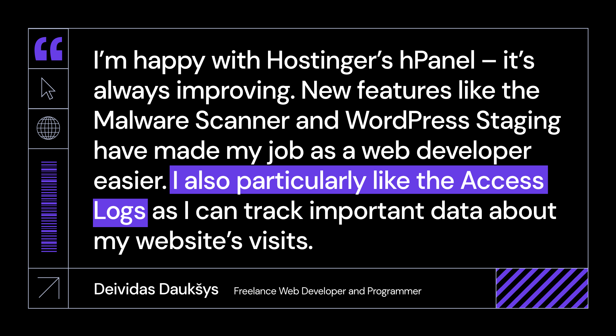 We are proud to see how Deividas can save money while still delivering the best service to his clients with our cloud hosting service. Furthermore, our hPanel and its advanced features let him develop his projects faster and with higher quality.