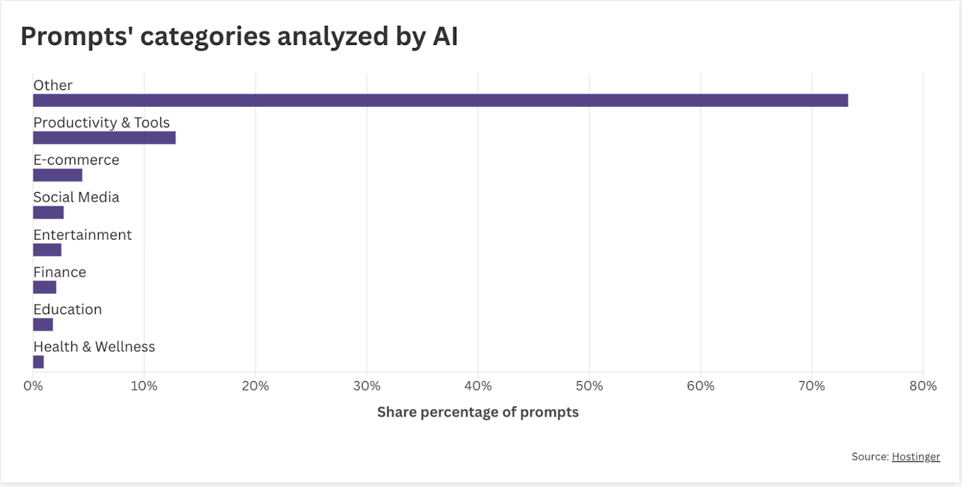What are people building with Hostinger Horizons? A wide variety of things. While Productivity & Tools stands out as the most popular defined category, users are also creating projects in E-commerce, Social Media, Entertainment, Finance, Education, and Health & Wellness categories. The majority of prompts – over 70% – fall into the Other category. This share highlights just how creatively people are using AI, often in ways that defy traditional labels. It’s clear that Hostinger Horizons isn’t just helping users build websites – it’s empowering them to bring bold, unconventional ideas to life.