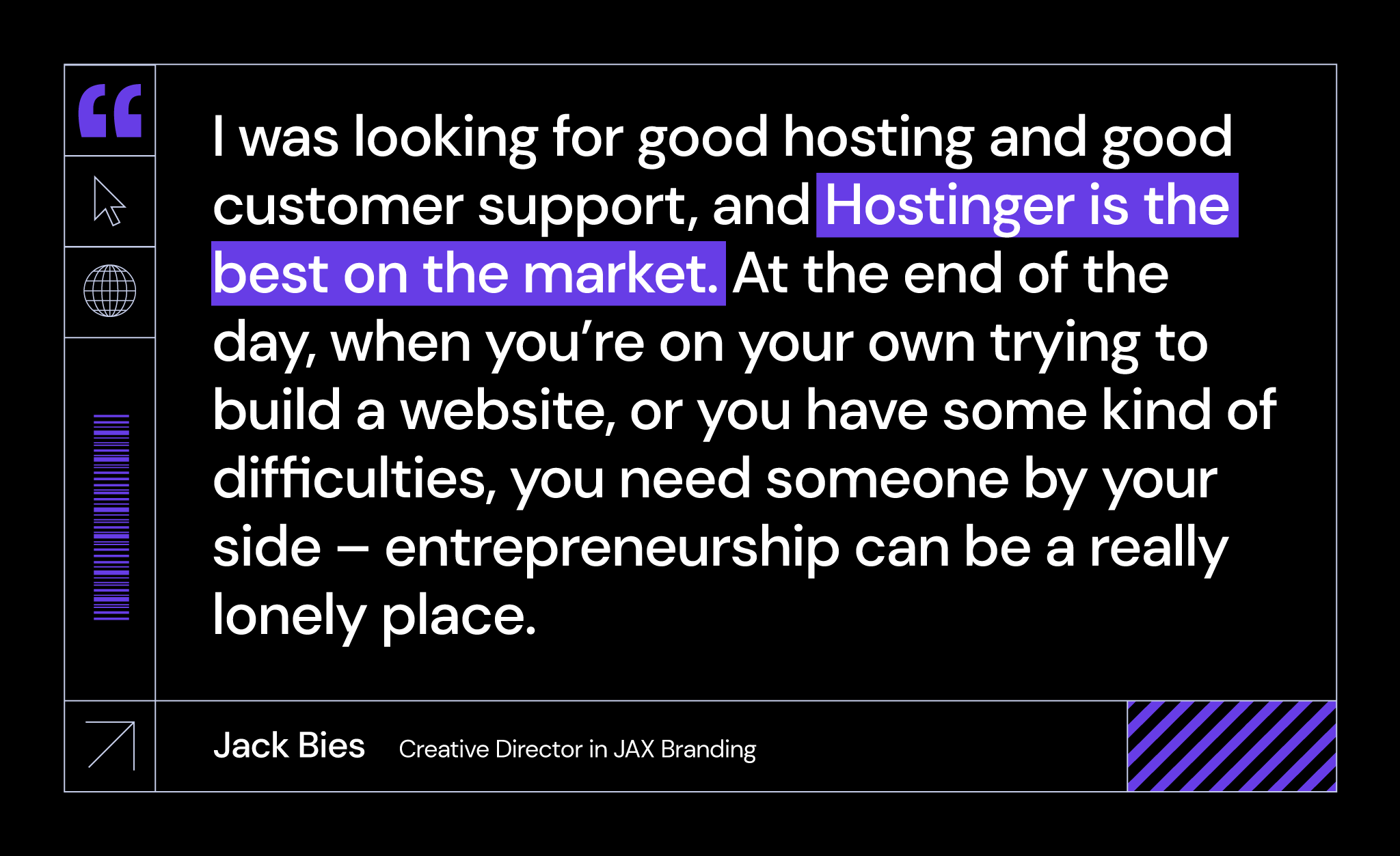Working with companies that support your business’s success is crucial when you’re an entrepreneur. Jack Bies, a branding agency owner, has tried various hosting providers to build his websites, but his positive experience with Hostinger made him a loyal customer. Learn how our services have supported his entrepreneurial journey and boosted his website speed.