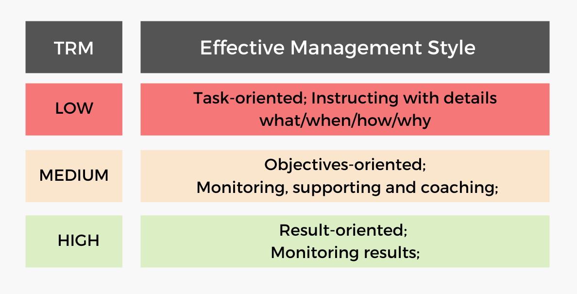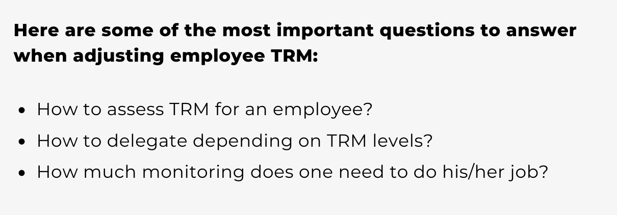 It’s highly unlikely for employees to have high TRM at all times. This is especially the case in dynamic organizations, as personal TRM changes with every new task, role, or project. It is up to the manager to adjust their work by using the TRM framework.