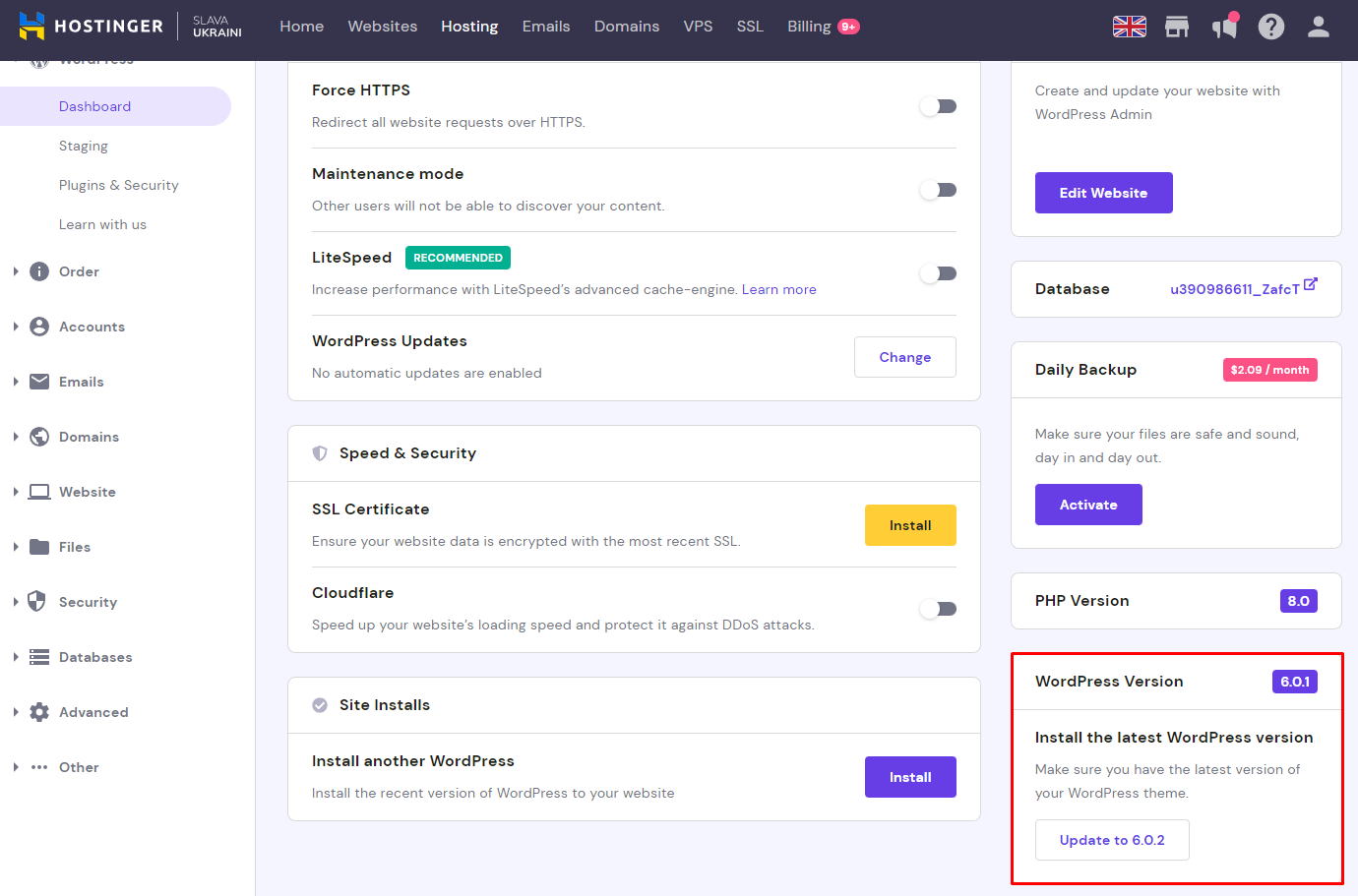 Alternatively, you can update your WordPress site from hPanel’s WordPress dashboard. You’ll find the WordPress version section on the bottom-right section, and the update button will be available if you’re not running the latest WordPress version.