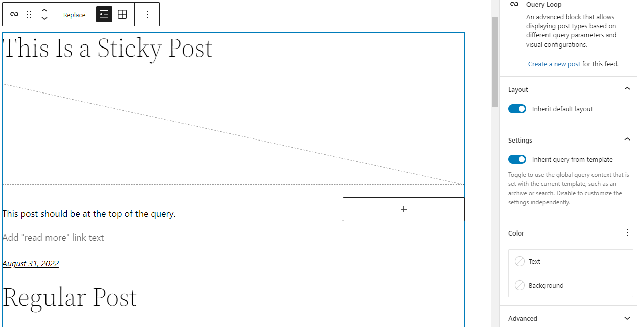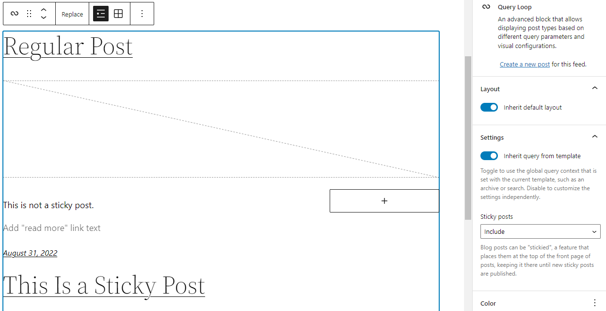 For instance, when you have a sticky post and enable the inherit query settings for the query loop block, the sticky post won’t appear at the top of the query loop. The sticky posts settings in the block settings also won’t work correctly.