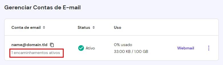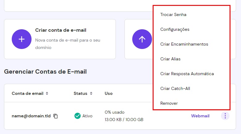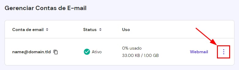 A seção Gerenciar contas de e-mail fornece informações sobre o nome de suas contas de e-mail, status, uso de disco, um salto rápido para Webmail e o botão Opções (⋮)