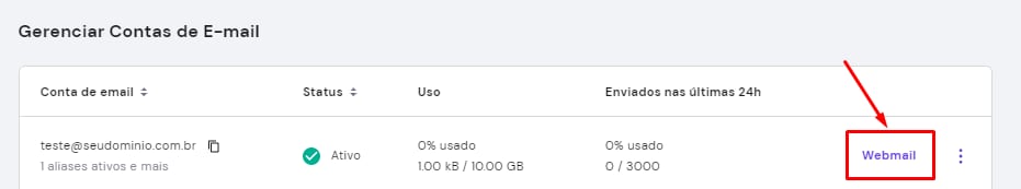 Você também sempre pode ser redirecionado para o link do webmail pelo painel da hospedagem mesmo. Basta acessar o menu de Emails → selecionar o nome do domínio → clicar no botão webmail: