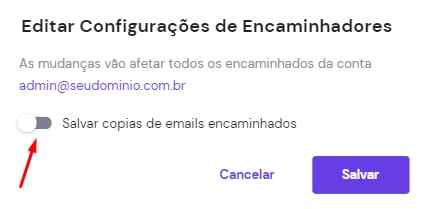 Uma janela abrirá e nela você poderá escolher uma caixa de e-mail, a partir da qual as mensagens serão encaminhadas, e poderá inserir um endereço de e-mail, para o qual tais mensagens serão encaminhadas. Por padrão, uma cópia dos e-mails é mantida na caixa de e-mail original: