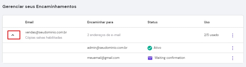 Você verá os encaminhamentos já criados na seção Gerenciar Encaminhamentos. Se algum endereço de e-mail tiver vários encaminhamentos configurados, você verá todos eles logo abaixo da flecha ↓