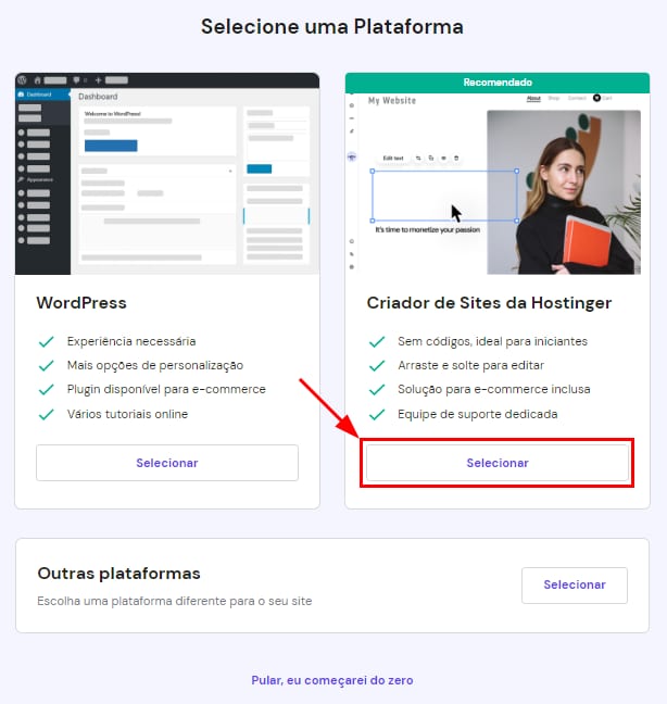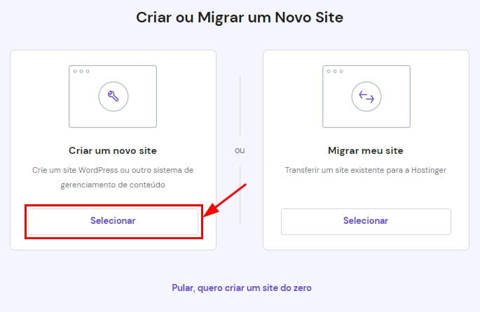 Se você estiver usando outro CMS para o seu site, como o WordPress, e quiser experimentar o Website Builder, precisará aplicar essa alteração no painel de controle e criar seu site. Basta seguir este guia: Como mudar para o Hostinger Website Builder .