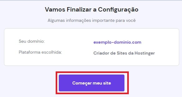 Depois, será necessário confirmar as informações do nome de domínio escolhido. Se você precisar fazer mudanças nas informações, passe o mouse sobre o nome de domínio ou sobre o nome da plataforma. Quando tudo estiver pronto, clique em Começar meu site:
