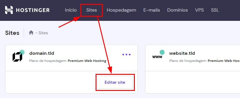 E, para acessar o Criador de Sites a qualquer momento, vá para o hPanel e entre na seção Sites. Clique em Editar site ao lado do domínio que deseja editar: