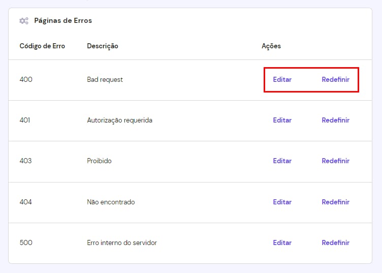 A maioria dos erros exibidos pelo seu site podem ser totalmente personalizados. Você pode enviar seu próprio código HTML que será usado como Página de Erro para seu site.