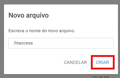 Insira “.htaccess” (certifique-se de que o ponto foi adicionado no início) e clique em Criar: