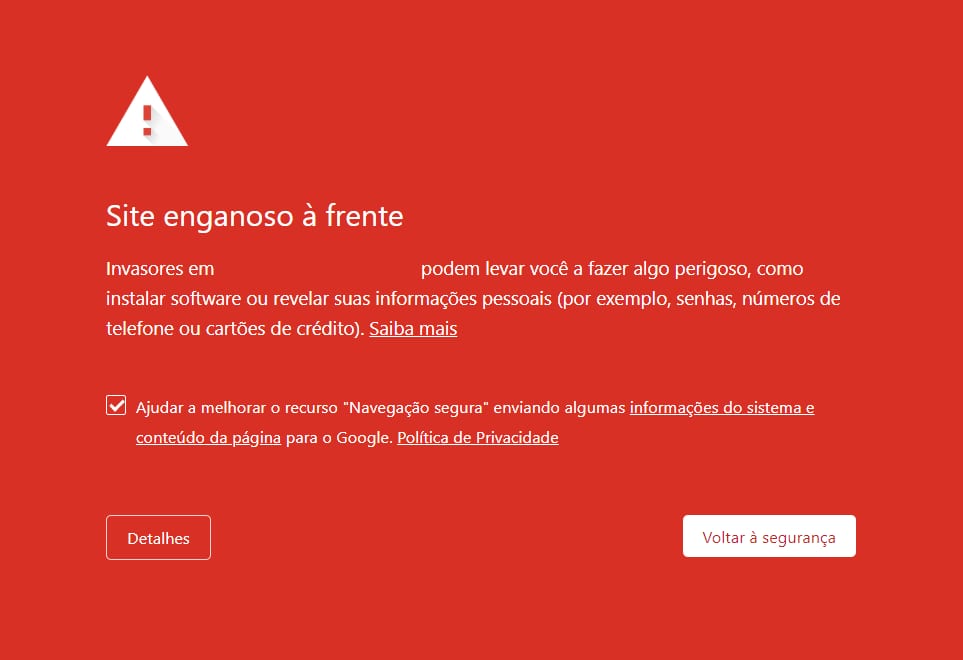 Isso significa que o Relatório de Transparência do Google analisou seu site e encontrou conteúdo potencialmente malicioso. A fim de proteger você e seus visitantes, ele mostrará esta mensagem de aviso antes que você execute qualquer ação.