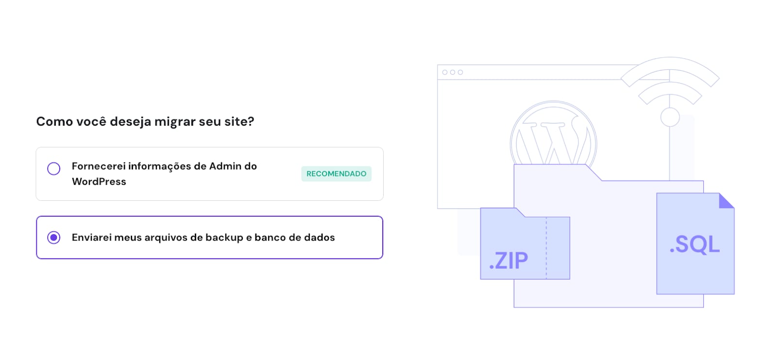 Crie uma solicitação de migração usando a opção WordPress e selecione Enviarei meus arquivos de backup e banco de dados