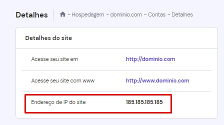 Você encontrá seu endereço IP na janela Detalhes do site: