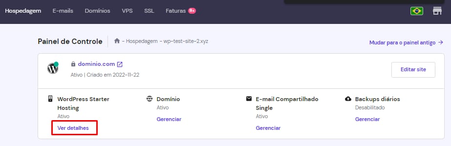 Substitua [ip-da-sua-hospedagem] com o IP do seu plano de hospedagem. Para encontrar o seu endereço de IP, vá até Hospedagem e clique em Gerenciar ao lado do nome de domínio que você quer analisar. Depois, clique em Ver detalhes: