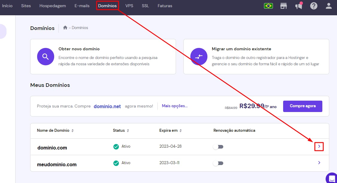 Se você já possui o seu domínio, basta acessar no seu painel na aba “Domínios” e selecionar qual você deseja proteger: