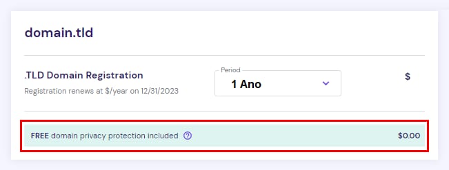 Se você vai solicitar um novo domínio, verifique se a proteção de privacidade foi adicionada gratuitamente no carrinho antes de prosseguir com a finalização da compra: