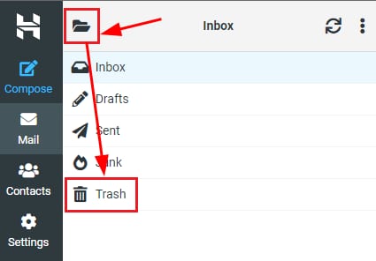 Se você estiver usando o e-mail da Hostinger, as mensagens excluídas de qualquer pasta são movidas automaticamente para a pasta Lixeira, onde são mantidas por 30 dias. Para recuperar uma mensagem excluída, abra sua conta de e-mail via Webmail, clique no ícone da pasta e selecione Lixeira: