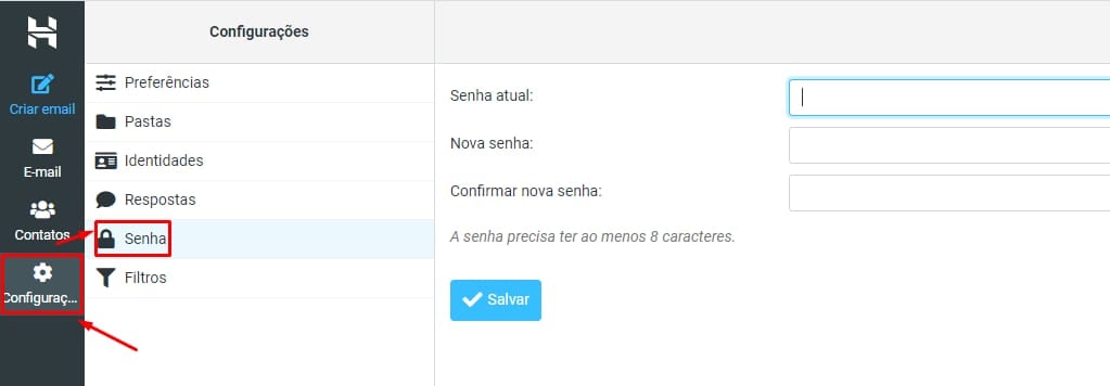 Se você se lembra da sua senha atual, ou se já está no painel da sua conta de e-mail, você pode atualizar a senha pelo Webmail mesmo. Basta fazer login no Webmail, abrir as Configurações Senha: