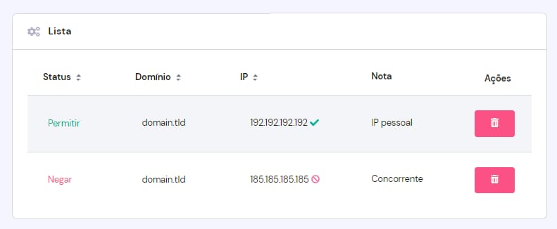 Adicione um IP para o qual deseja criar regras, escreva uma uma observação (opcional) e clique em Adicionar. A lista de todas as regras estará disponível abaixo: