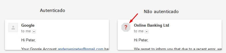 O Gmail mostra um ponto de interrogação vermelho como foto de perfil para remetentes de email não autenticados.