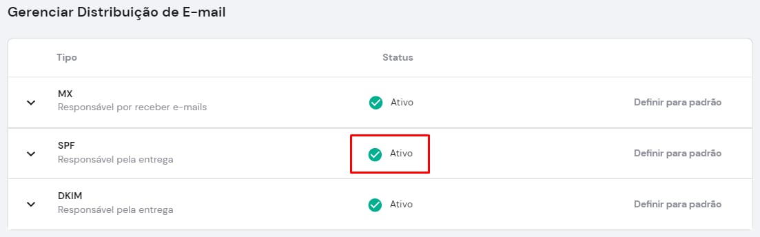 Quando o registro SPF estiver corretamente propagado, você verá o status como Ativo: