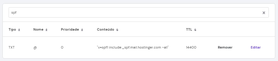 Para domínios que estão apontando para a Hostinger pelos nameservers (servidores DNS), o registro SPF é adicionado automaticamente por padrão. Você pode encontrar esse registro no Editor de Zona DNS ao inserir “spf” no campo de pesquisa:
