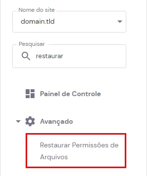 Para corrigir rapidamente todas as suas permissões de arquivo, vá para Sites → Gerenciar , procure Restaurar permissões de Arquivos no campo de pesquisa e clique nele: