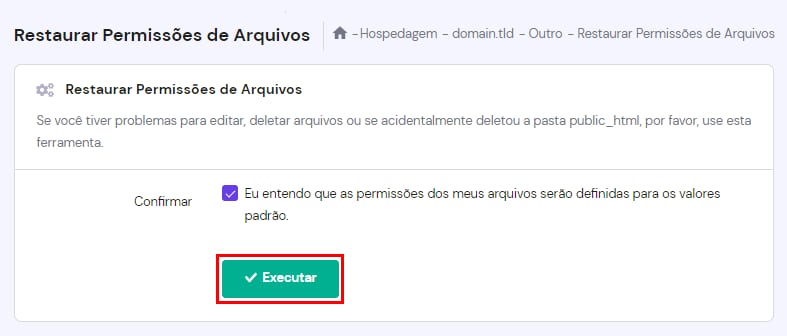 Marque a opção para confirmar que deseja definir os arquivos e pastas para as permissões padrão e clique em Executar: