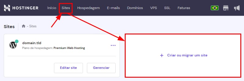 Para hospedar vários sites, vá para a seção Sites do seu painel e clique em Criar ou migrar um site: