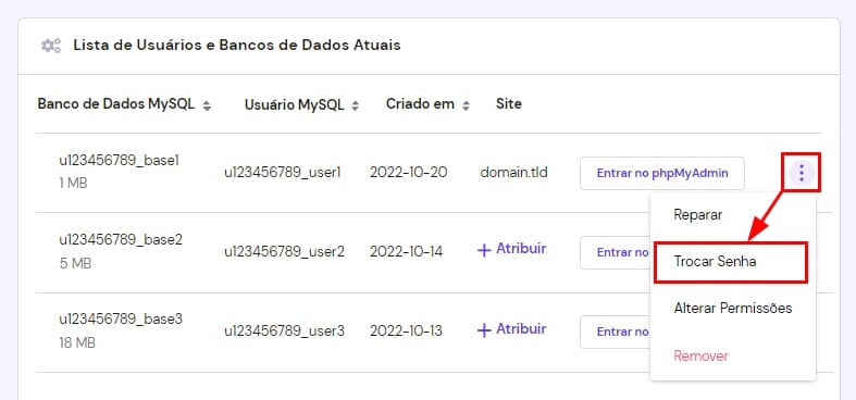 Clique no símbolo ⋮ ao lado do banco de dados que deseja redefinir a senha e selecione Trocar Senha: