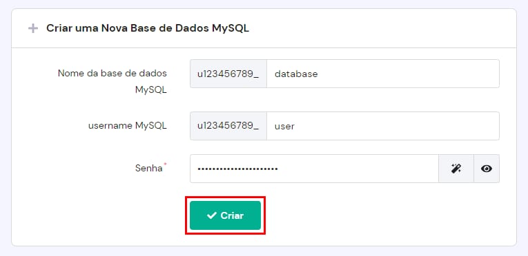 Na seção Criar uma Nova Base de Dados MySQL e Base de Dados de Usuário, basta inserir o nome, usuário e senha que deseja dar ao novo banco. Ao final, clique em Criar:
