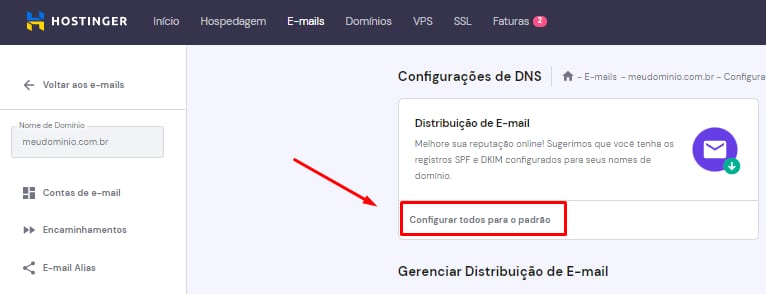 Se o seu domínio está apontando para o Hostinger por nameservers, você pode definir os registros DNS de e-mail corretos do hPanel: basta ir em E-mails → nome do domínio → configurações de DNS e clicar em Configurar todos para o padrão: