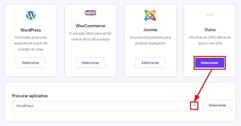 Selecione Outro e use a barra de pesquisa para encontrar os scripts mais populares, como PrestaShop, Abante Cart, osCommerce e muito mais: