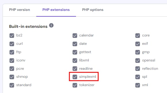 SimpleXML está habilitado por padrão em todos os nossos planos de hospedagem Web e Cloud! Você pode verificar isso na seção Configuração do PHP do hPanel: