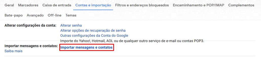 Então, abra o Google Workspace email e acesse as Configurações. Clique na aba Contas e Importação, e na segunda seção selecione Importar mensagens e contatos. Em seguida, é só seguir os passos mostrados e clicar em Iniciar importação: