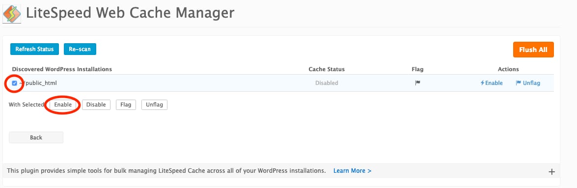 Assim que aparecer as instalações do WordPress, tenha certeza de selecionar a que deseja ativar e clique em Enable: