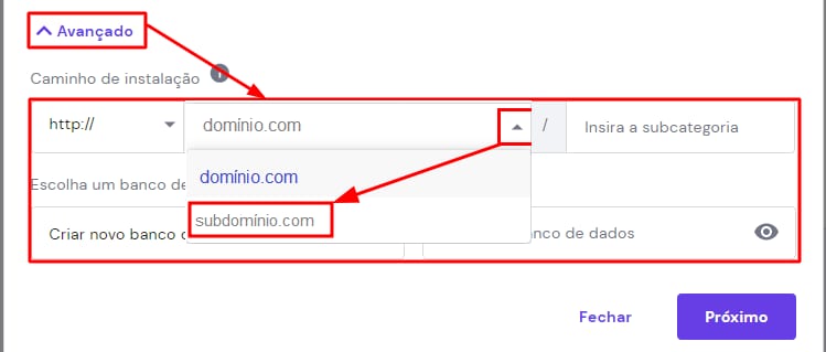 Se quiser especificar um subdiretório personalizado ou usar um banco de dados existente, clique em Avançado e preencha os campos necessários: