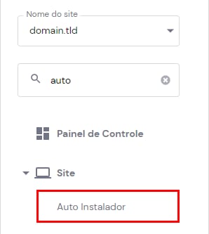 Faça login no seu painel e clique em Sites → Gerenciar, vá para a barra lateral e insira Auto Instalador no campo de pesquisa:
